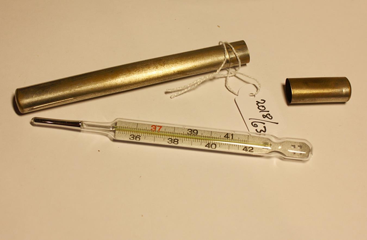 Kvikasilfur-hitamælir í er í málmhulstri. Merktur Reykjavíkur Apótek, Scheving Throsteinsson.Efni gler, kvikasilfur, málmur. Aldur 1940-1950. Kemur úr eigu Kristínar Ólafsdóttur (1906-1993) í Frón
