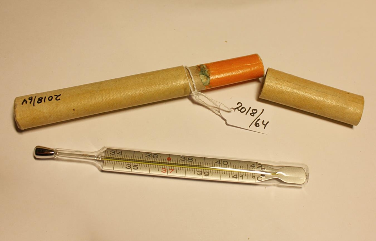Kvikasilfur-hitamælir í pappíshulstri. Efni gler, kvikasilfur, pappi. Aldur 1950-1960. Kemur úr eigu Kristínar Ólafsdóttur (1906-1993) í Frón