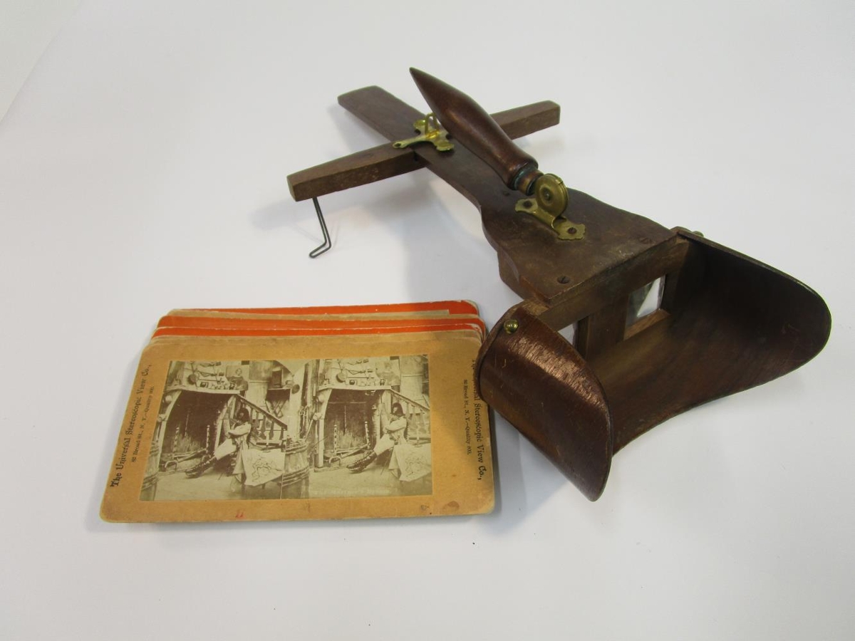 Myndkíkir, stereoscopic, sýnir myndir í þrívídd. 11 stk. myndaspjöld eru meðfylgjandi.