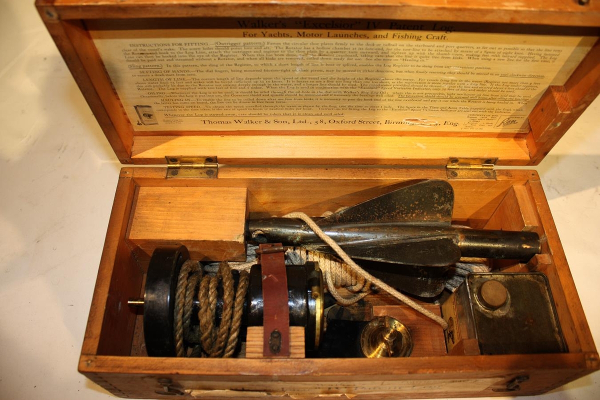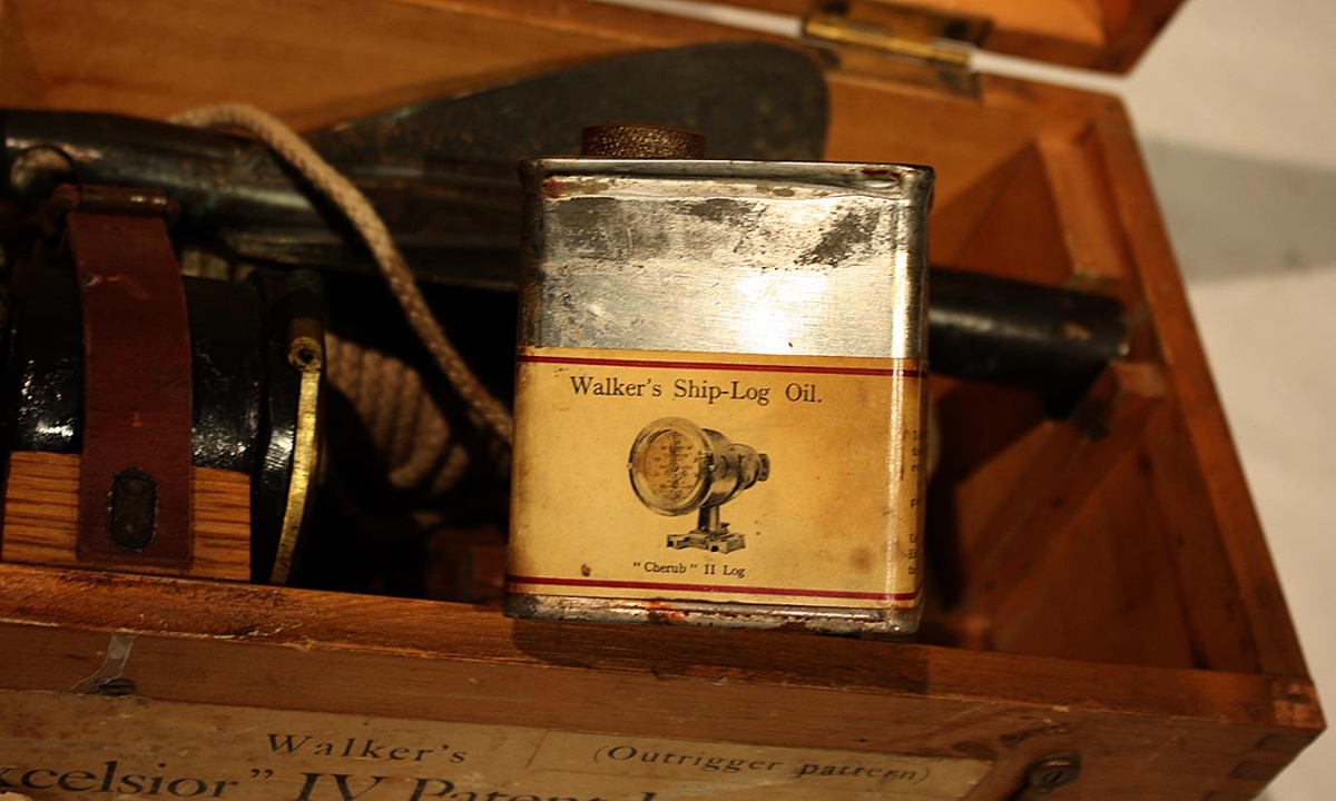Vegmælir í trékassa. Í kassanum er úr, einnig kallað loggklukka, flundra og langur og mjór sívalningur úr tré. Merkt: Walker´s Excelsior IV Patent log". Virðist það vera ónotað.Það telst vera hluti af vegmælinum en vantar mæliskífuna framan á. Logglínan var tengd aftan í þetta tæki en á henni var hjól og flundra. Á úrinu eða loggklukkunni eru þrír vísar, einn stór og þrír minni. Stóri vísirinn snýst einn hring fyrir hverjar hundrað sjómílur. Neðri vísirinn til hægri snýst einn hring fyrir hverja sjómílu en neðri vísirinn til vinstri einn hring fyrir þúsund sjómílur.Flundran er málmsívalningur með 4 spöðum. Í sívalninginn er tengd lína og er hann dreginn á eftir skipinu í henni. Vegmælir er notaður til að mæla með siglda vegalengd. Óvíst um uppruna
