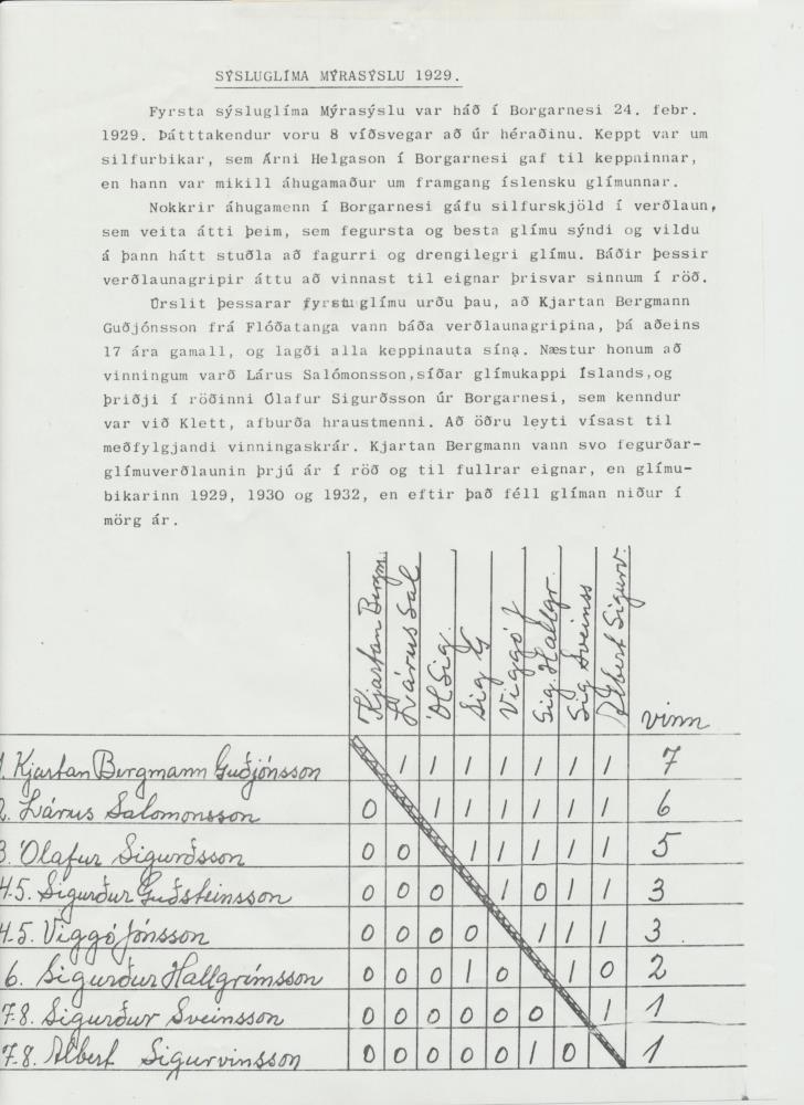 Fyrsta sýsluglíma Mýrasýslu var háð í Borgarnesi 24. febrúar 1929. Þátttakendur voru 8 víðsvegar að úr héraðinu. Keppt var um silfurbikar, sem Árni Helgason í Borgarnesi gaf til keppninnar, en hann var mikill áhugamaður um framgang íslensku glímunnar.