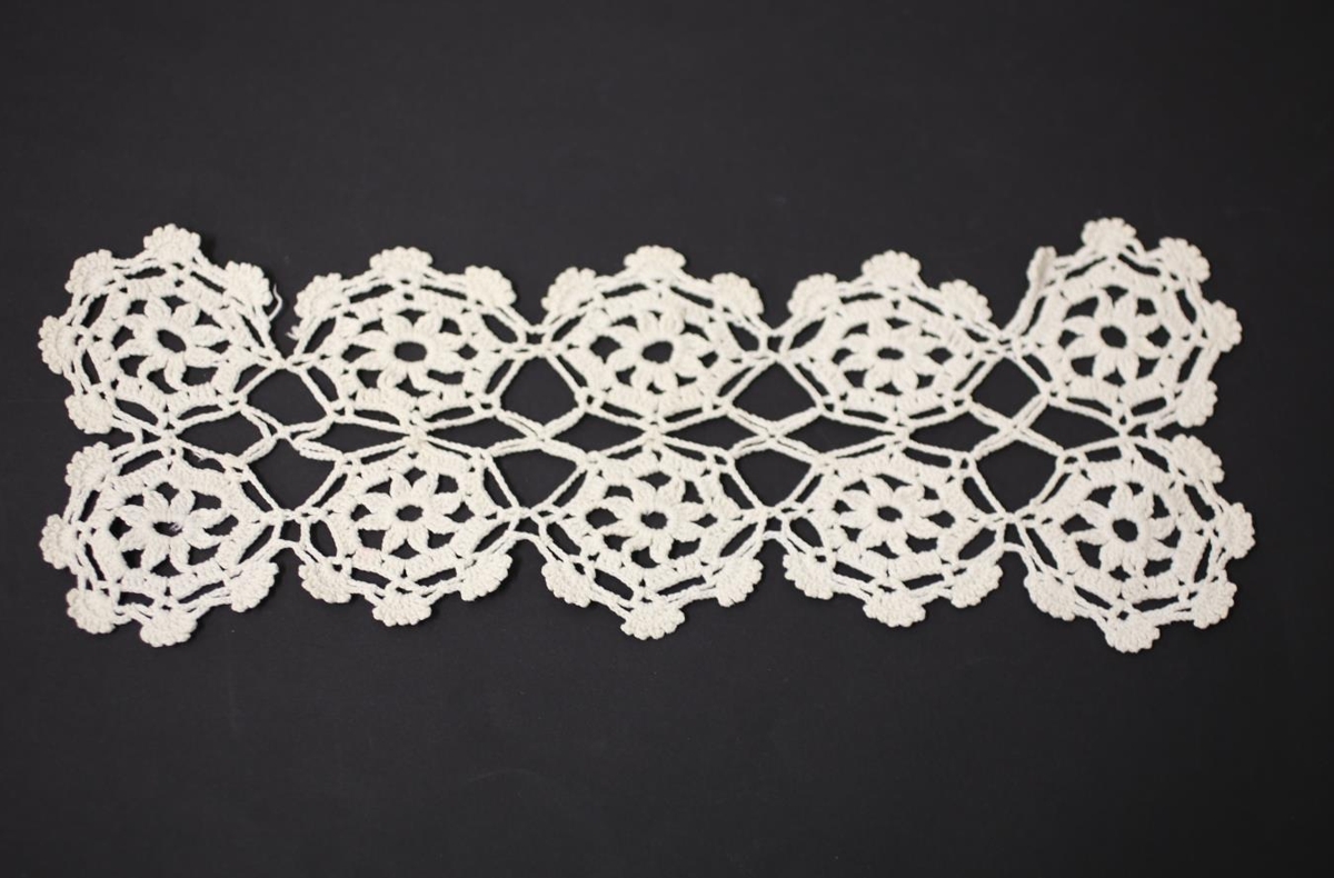 Drapplituð hekluð blúnda sem gerð er úr 10 litlum dúllum sem eru 6 cm í þvermál hver. Kom til safnsins úr búi Sigurðar Blöndal skógræktarstjóra og Guðrúnar Sigurðardóttur á Hallormsstað.