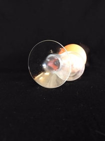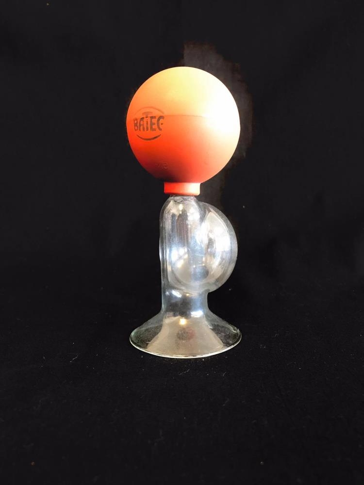 Brjóstapumpa úr gleri með rauðri gúmmípumpu. Á gúmmíinu er stimpill með merki BATE.