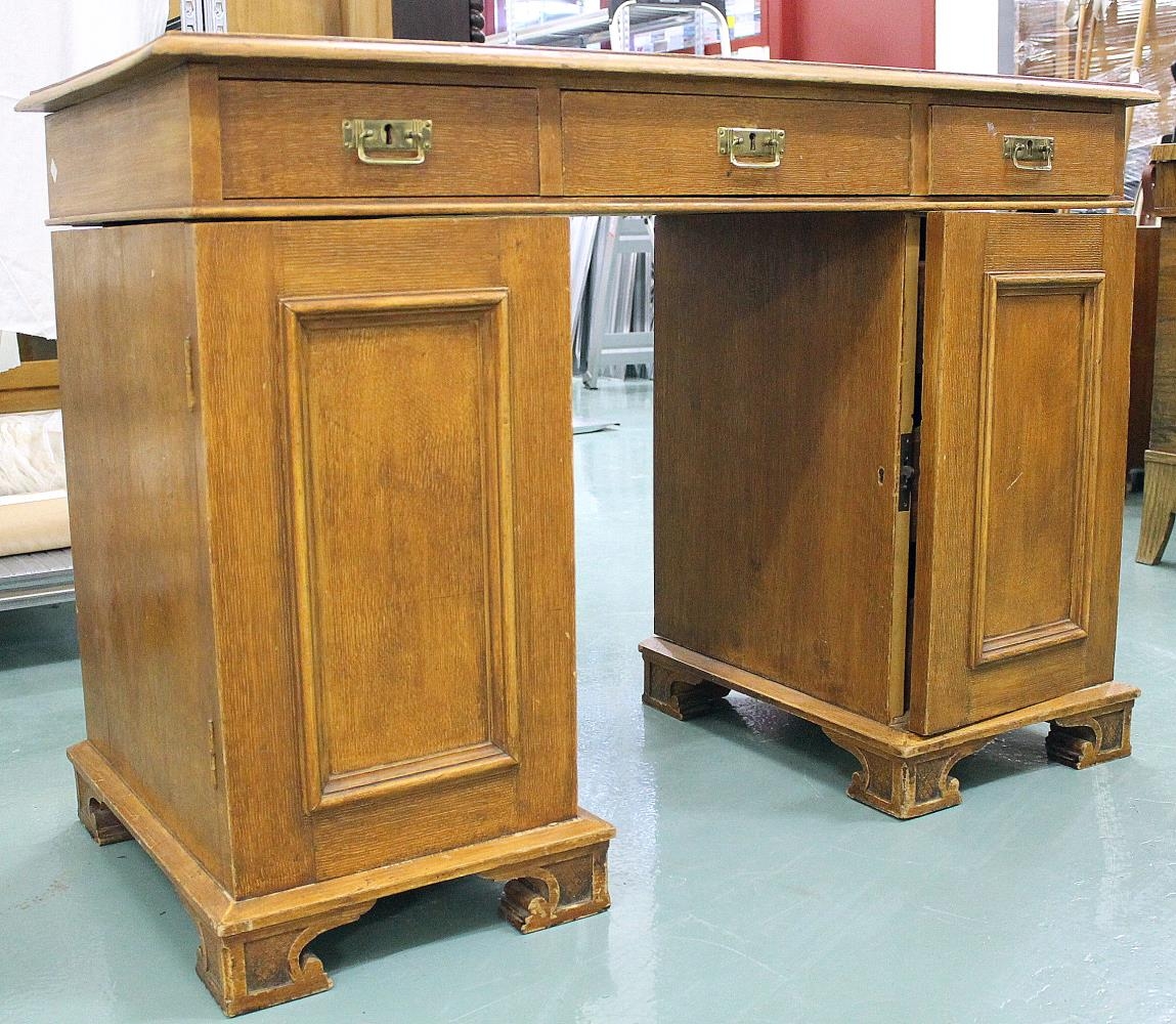 Borðið er smíðað úr furu, málað ljósbrúnt með viðaráferð. Það er með þrem skúffum efst og hurðum til hliðanna.