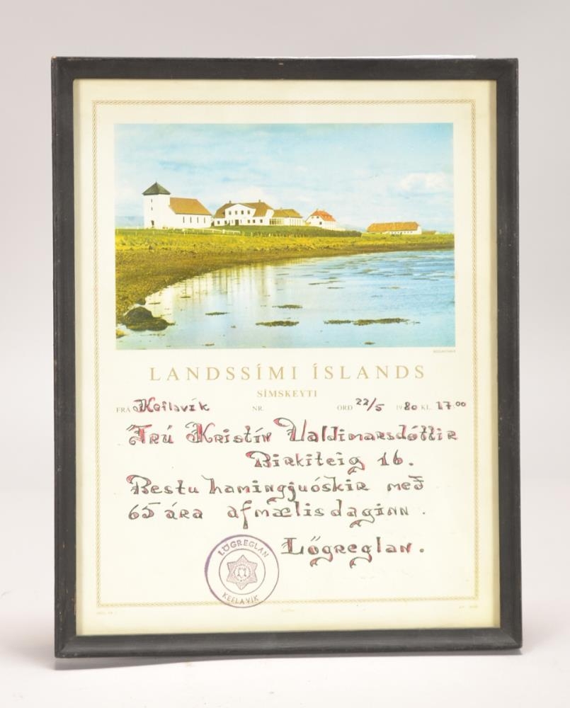 Innrammað heillaóskaskeyti til Kristínar Valdimarsdóttur með mynd af Bessastöðum og textanum: „Keflavík 22/5 1980 kl. 17:00. Frú Kristín Valdimarsdóttir Birkiteig 16. Bestu hamingjuóskir með 65 ára afmælisdaginn. Lögreglan“. Stimplað með stimpli Lögreglunnar í Keflavík