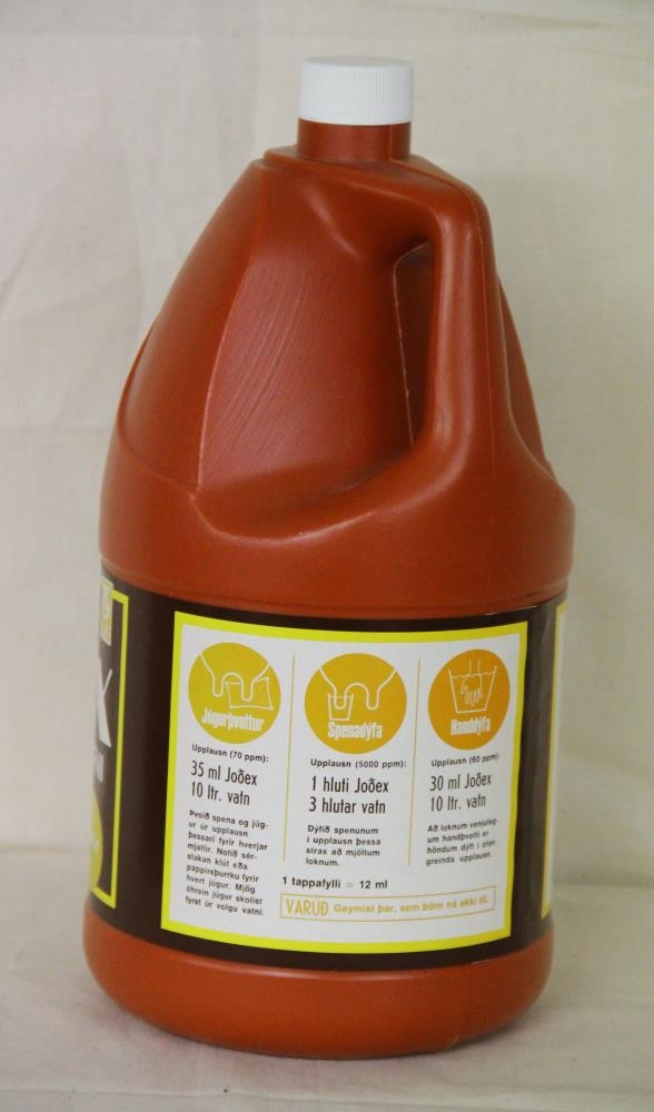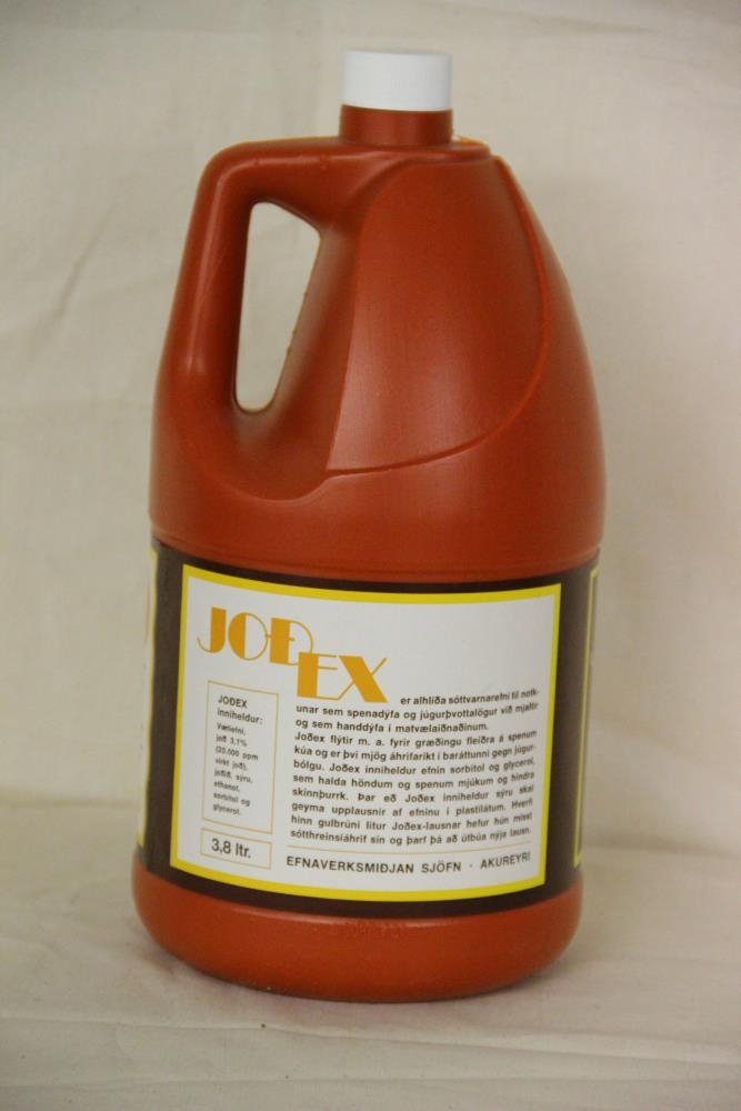 Rauðbrúnn plastbrúsi með haldi/gripi og hvítum tappa. Áletrun á álímdum miða í brúnum, gulum og hvítum lit: Joð ex sóttvarnarefni. Verndar - mýkir - græðir. Notkunarreglur fyrir: Júgurþvott, spenadýfu og handdýfu. Eiginleikar og innihaldslýsing. Joð-ex er alhliða sóttvarnarefni til notkunar sem spenadýfa og júgurþvottalögur við mjaltir og sem handdýfa í matvælaiðnaði