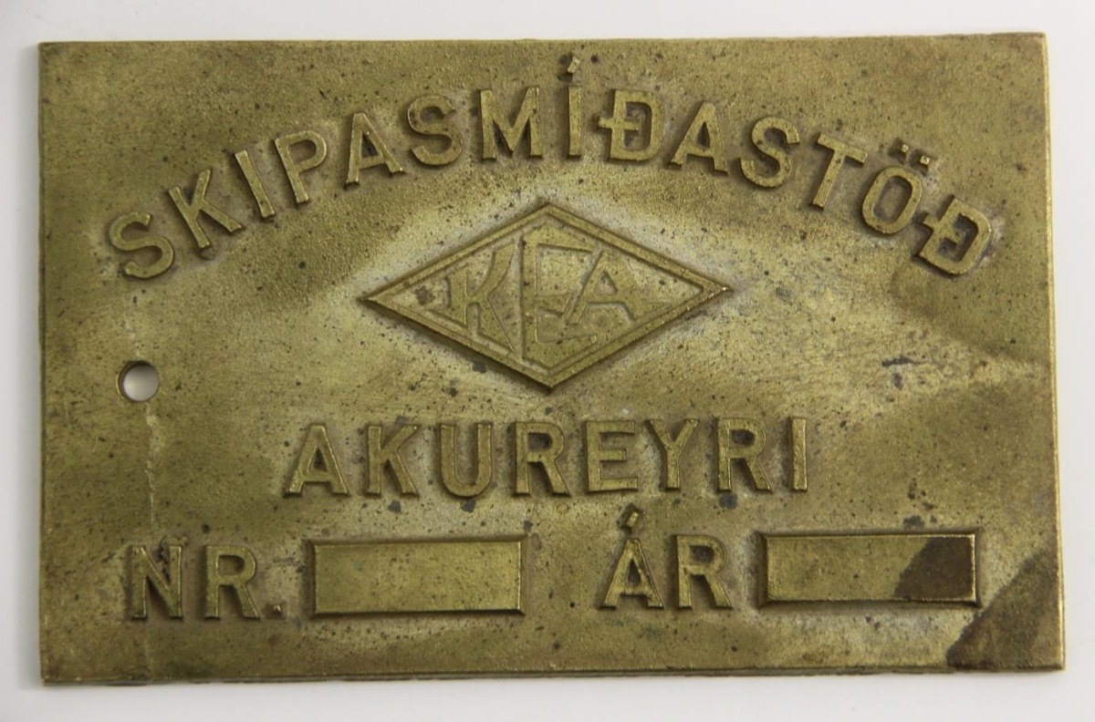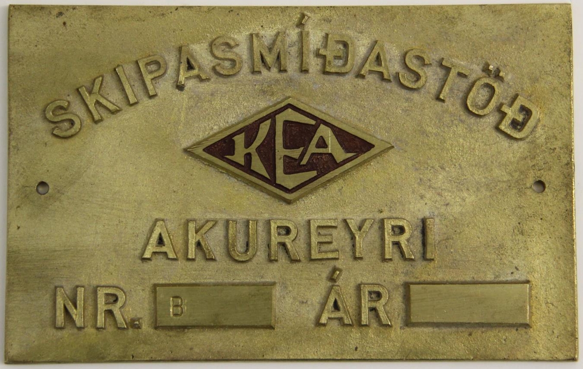 Tvær koparplötur með eftirfarandi upphleyptu letri: Skipasmíðastööð - KEA-tígullinn - Akureyri - Nr. (og auður flötur) - Ár (og auður flötur.