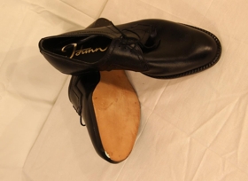 Skórnir eru svartir með svörtum reimum og sléttum botni. Þeir eru ónotaðir. Gætu hafa verið of litlir á eiganda. Skórnir hafa sennilega ekki verið söluvara því ekkert stærðarnúmer er á þeim. Líklega nr. 43.