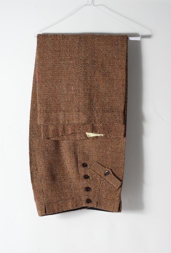 Buxur úr brúnu og gulu ullarefni. Hnepptar með fjórum tölum á hvorri hlið. Tveir skávasar með loku sem hneppt er með brúnni tölu. Heimasaumaðar. Kom til safnsins úr búi Sigurðar Blöndal skógræktarstjóra og Guðrúnar Sigurðardóttur á Hallormsstað. Voru í eigu Sigrúnar, dóttur þeirra.