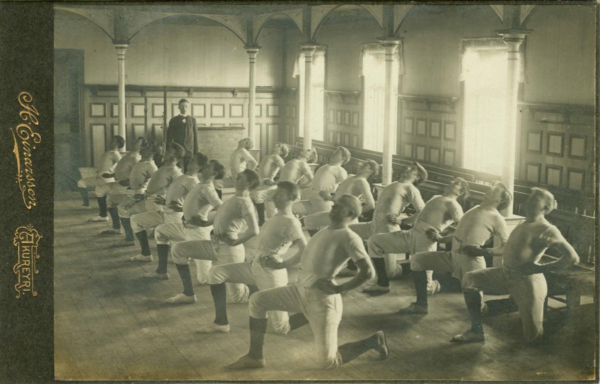 Fimleikaflokkur karla sýnir æfingu í samkomusal. Allir eru þeir klæddir í sams konar íþróttaföt, boli, hnébuxur, svarta sokka og létta skó. Stjórnandi flokksins stendur aftan við hópinn. Sýningarflokkur Lárusar Rist. Sjá Hallgrímur Einarsson. Akureyri 1895-1930 Ljósmyndir, s. 52.