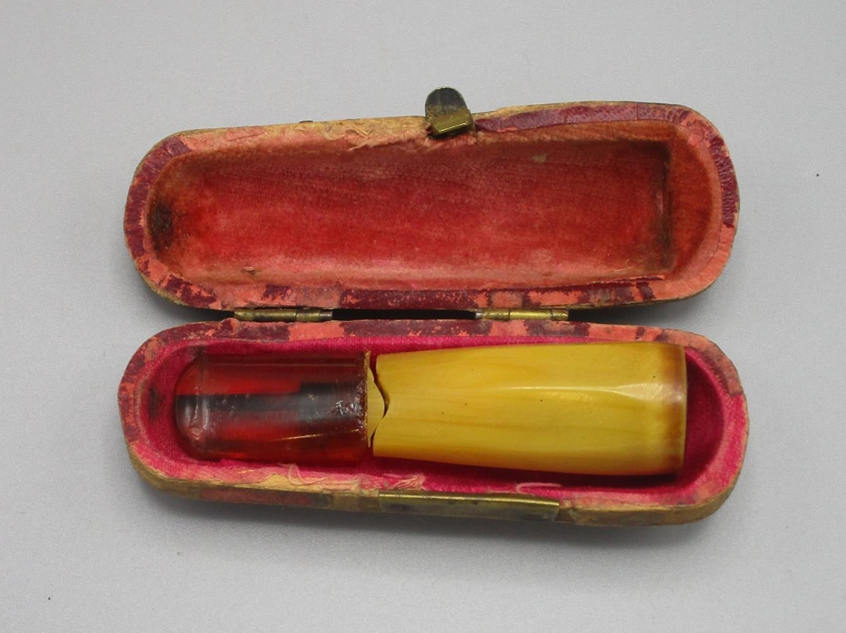 Vindlamunnstykki í viðarboxi. Munnstykkið er rautt og hvítt (farið að gulna). Tréhylkið er klætt innan með rauðu efni. Sagt úr eigu Riis kaupmanns í Stykkishólmi. Þegar hann reyndi að hætta að reykja gaf hann Ingigerði Ágústsdóttur (síðar prófastsfrú) munnstykkið, en hún var þá barn.