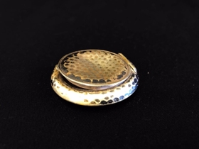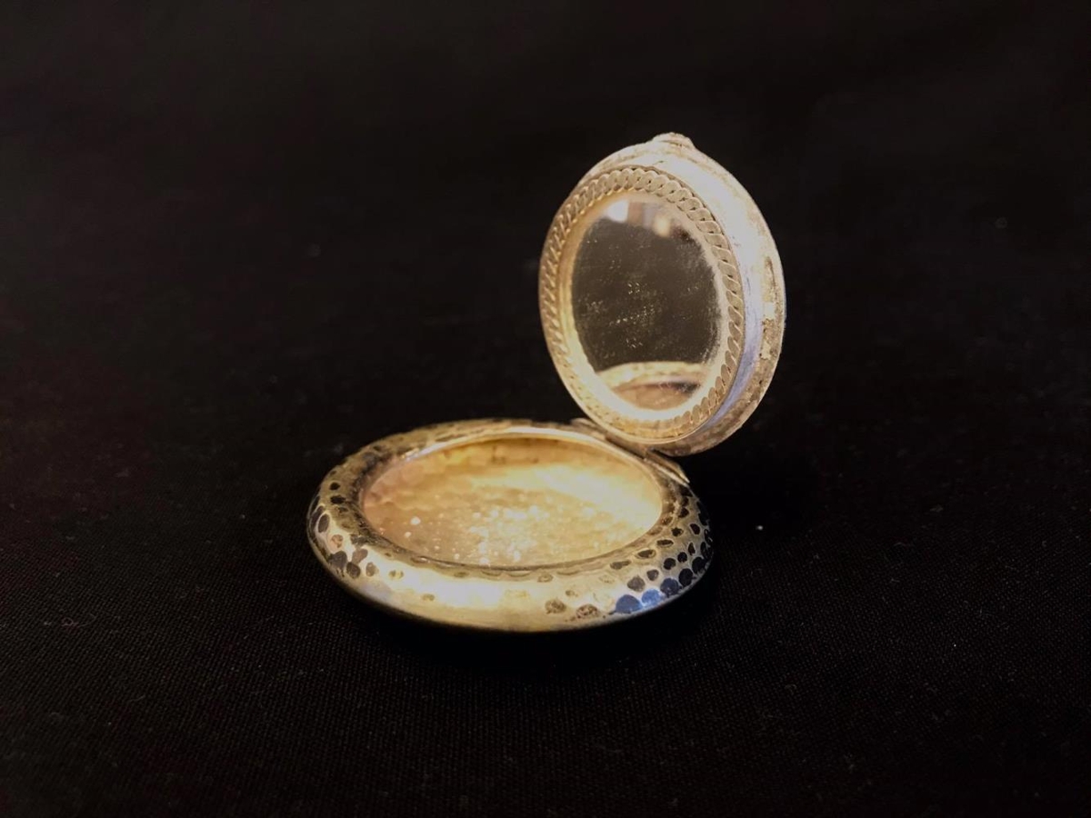 Lítil hringlaga silfur púðurdós með litlum spegli í loki. Járnið er með hamraðri áfer, áletrun Alpacca á botni dósar. Í kringum spegilinn er eins og fléttað silfurband. Leyfar af hvítu dufti, púðri, talkúm í skorum og botni dósar.