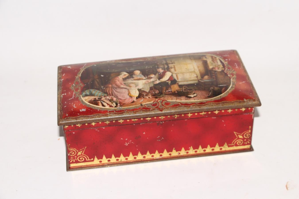 Brauðbaukur, úr blikki 20 x 9,5 x 6,7 (hæð) cm. Innan í loki stendur McVitie & Price Edinburgh. Aðallitur er rauður og er gylling til skreytingar, á loki, sem er svolítið kúpt, er mynd af fjölskyldu við borðhald (19. aldar mynd). Baukurinn er á ölmusualdri. Ekki yngri en 1950.