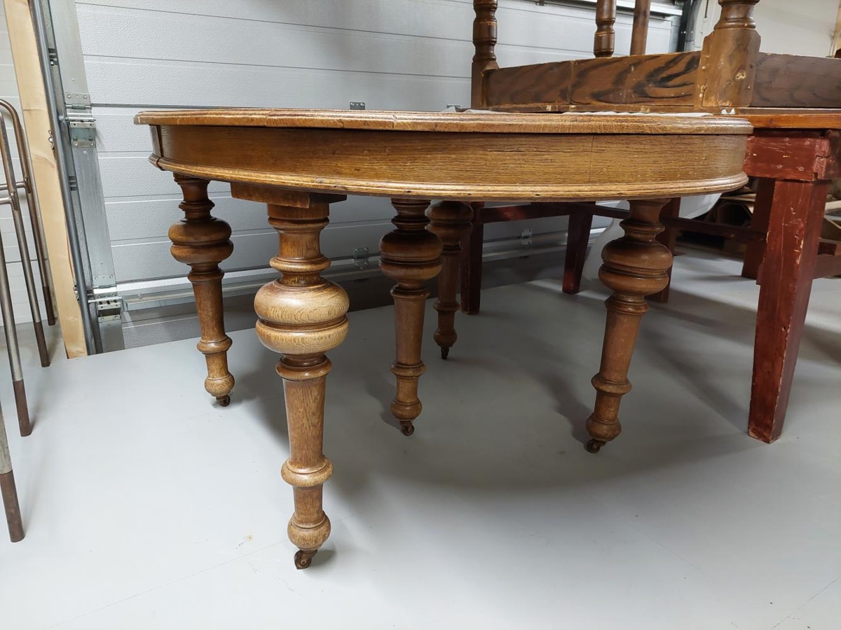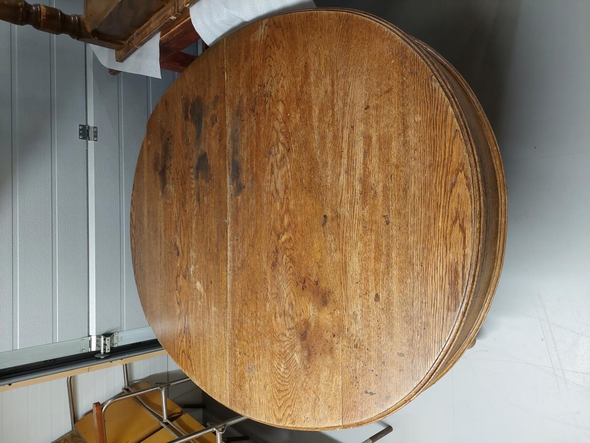 Stofuborð úr eik með sporöskjulagaðri plötu, 109 x 149 cm. Undir því eru fimm renndir fætur á járnhjólum, þvermál um 5,5-15,4 cm. Borðplatan er í tvennu lagi og má draga hlutana hvorn frá öðrum og lengja borðið upp í a.m.k. 296 cm, en öngvar fjalir fylgja til að setja á miðjuna. Fimmti fóturinn er undir borðinu miðju, er hann með skrúfgangi efst og má hækka hann og lækka eftir þörfum.