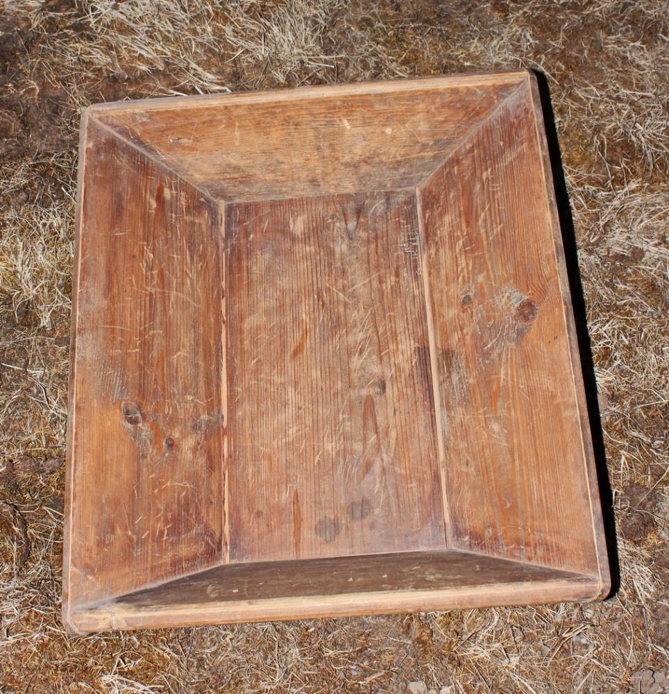 Trog úr furu, með venjulegu lagi. Það er að innanmáli 26 x 27 cm og 6,5 cm djúpt. Það er tréneglt og hefur verið brúnmálað utan en nú nær afmáður liturinn.