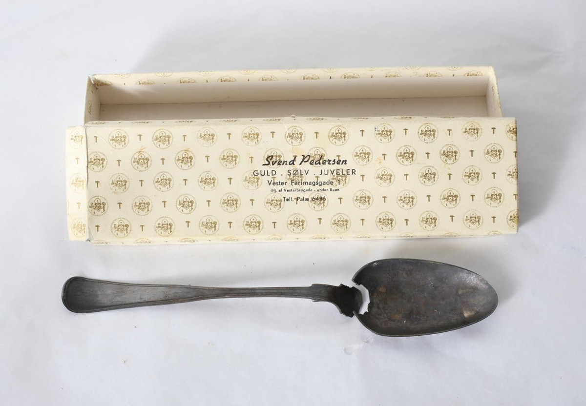 Brotin silfurskeið, blaðið brotið frá skaftinu. Aftaná skaftinu stendur SP og þrír ólæsilegir stimplar. Skeiðin er í hvítum kassa með gylltu munstri sem á stendur Svend Pedersen Guld. Sölv. Juveler. Vester Farimagsgade 1 Hj. Vesterbrogade - under Buen. Telf Palæ 6436. Aftaná kassanum stendur "Til Unnu og Braga frá Mömmu". Þar er vísað til Steinunnar Jónsdóttur Snædal og Braga Björnssonar sem bjuggu á Surtsstöðum í Jökulsárhlíð. Líklega er skeiðin frá móður Braga, Sigrúnu Jóhannesdóttur, sem bjó á Surtsstöðum. Skeiðin var varðveitt, ásamt öðrum gripum úr eigu Sigrúnar, í kofforti sem Guðrún Björnsdóttir, dóttir Sigrúnar og systir Braga varðveitti.
