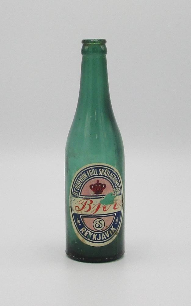 Græn glerflaska. Á miðanum stendur: H.F. ÖLGERÐIN EGILL SKALLAGRÍMSSON REYKJAVÍK. BJÓR.