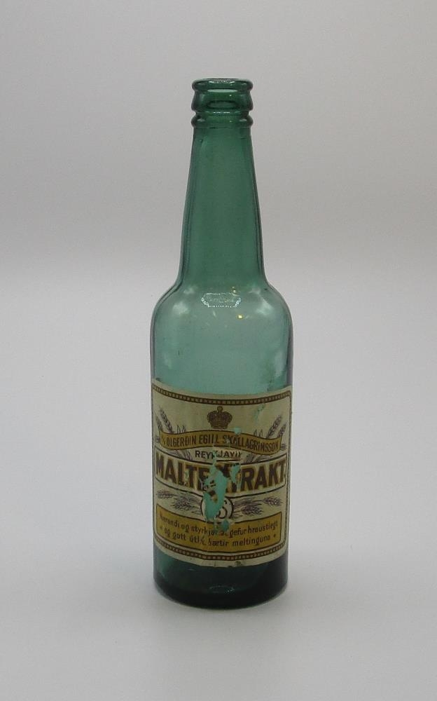 Græn glerflaska. Á miðanum stendur: H/F ÖLGERÐIN EGILL SKALLAGRÍMSSON REYKJAVÍK. MALTEXTRAKT. Nærandi og styrkjandi, gefur hraustlegt og gott útlit, bætir meltinguna.