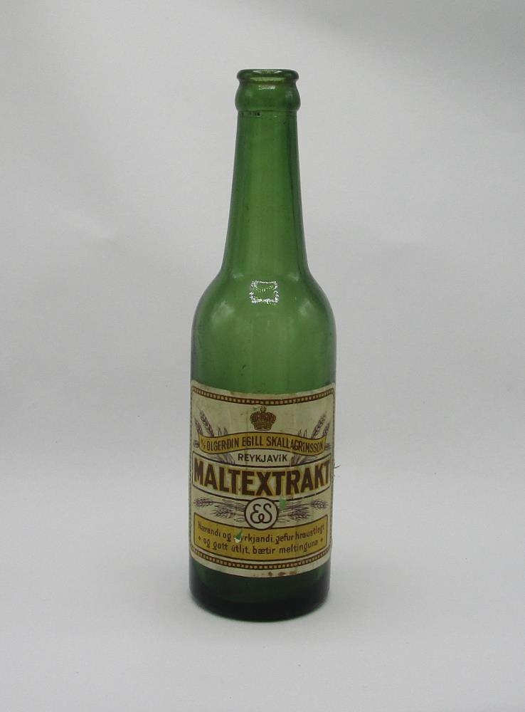 Græn glerflaska. Á miðanum stendur: H/F ÖLGERÐIN EGILL SKALLAGRÍMSSON REYKJAVÍK. MALTEXTRAKT. Nærandi og styrkjandi, gefur hraustlegt og gott útlit, bætir meltinguna.