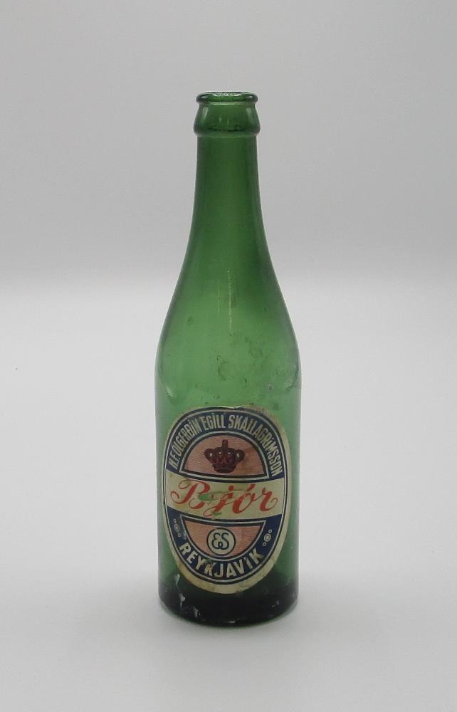 Græn glerflaska Egils bjór. Fannst uppi á háaloftinu að Silfurgötu 20 Stykkishólmi.