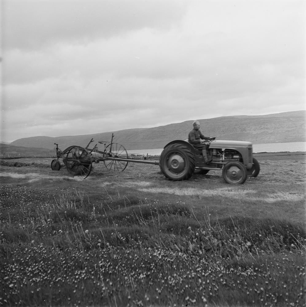 357. Laugaból í Ísafirði. Sigurður Þórðarson á nýjum Ferguson, með hestaverkfæri aftaní, eins og altítt var á fyrstu árum vélvæðingar í Djúpi. Sér út Ísafjörð.