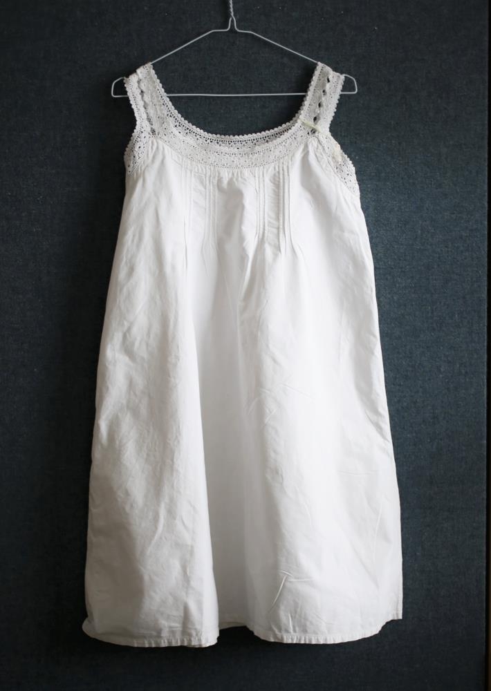 Hvítur náttkjóll úr lérefti með útsaumuðum upphafstöfum eiganda, "S.J". Kjólinn er ermalaus en hekluð blúnda í handvegi, hlýrum og hálsmáli. Þrír 14 cm langir saumar saman á fjórum stöðum, bæði aftan og framan á við hálsmál. Kom úr búi Sigrúnar Jóhannesdóttur, Surtsstöðum.