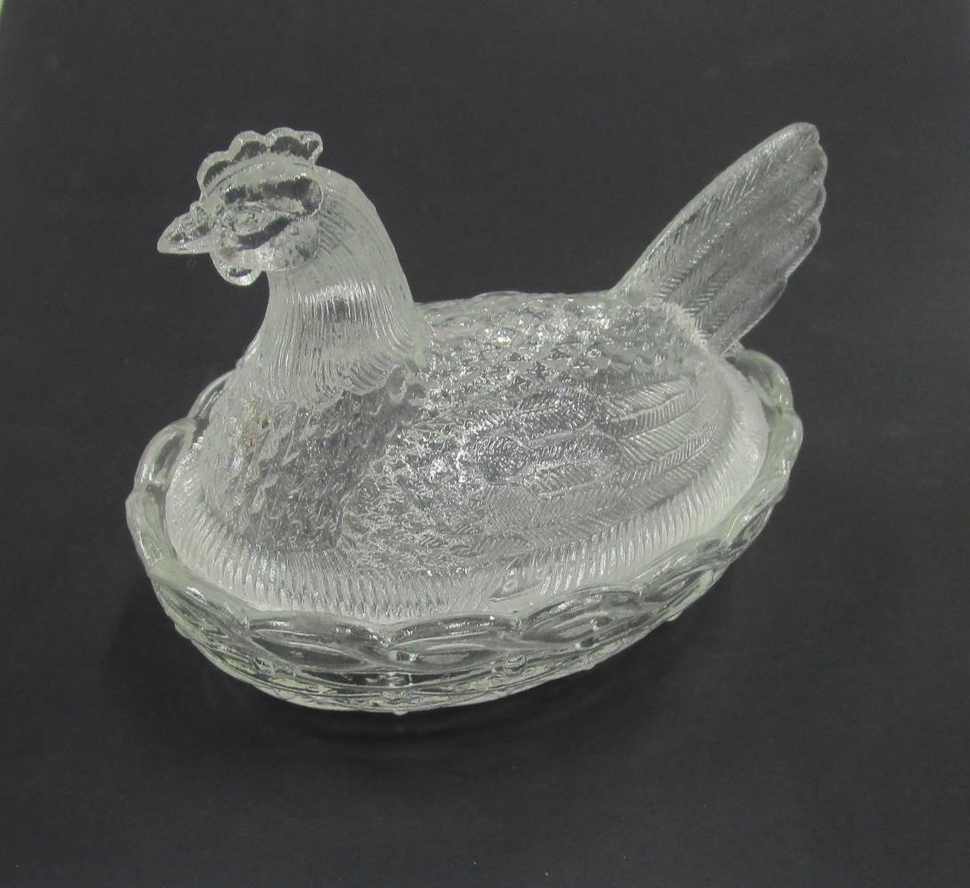 Krús eða skál með hænuloki. Hænan er útskorin í glerið.