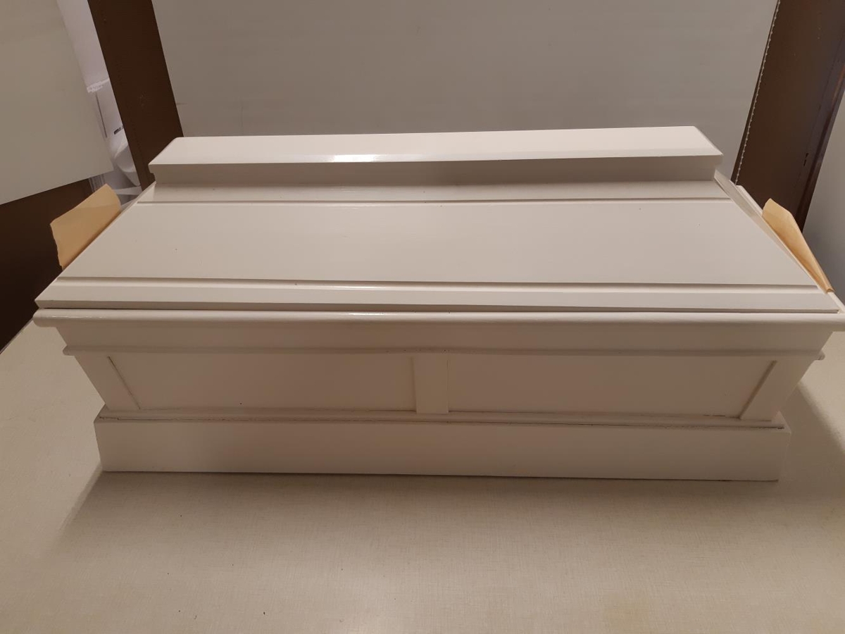 Hvítmáluð líkkista fyrir barn. Í kistunni eru bönd og fleira sem þarf við útför.
