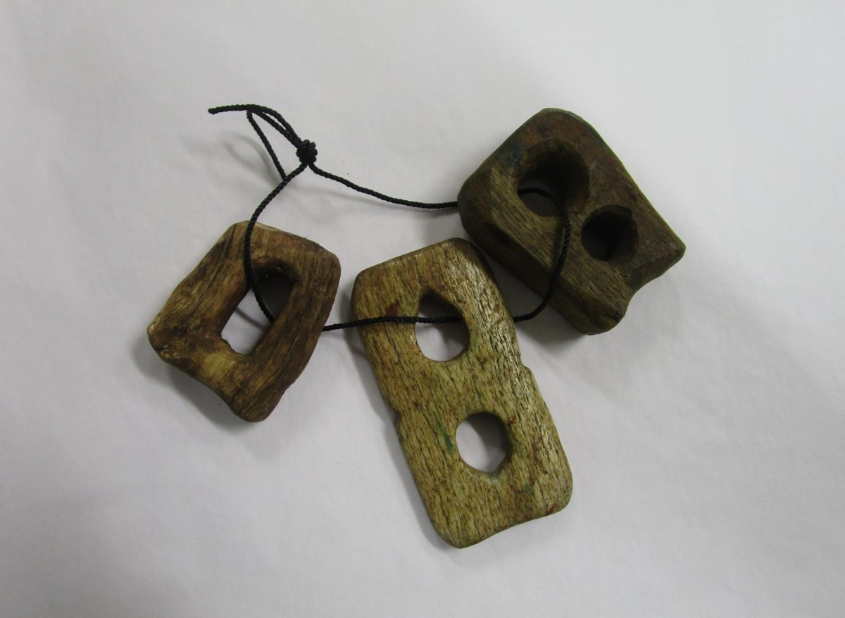 Þrjár mismunandi gjarðarsylgjur eða hagldir. a) L. 5,5; br. 4,5 cm með einu gati, úr horni. b) L. 6; br. 4,5 cm með tveimur götum, úr viði. c) L. 8,5; Br. 4,5 cm með tveimur götum, úr hvalbeini.