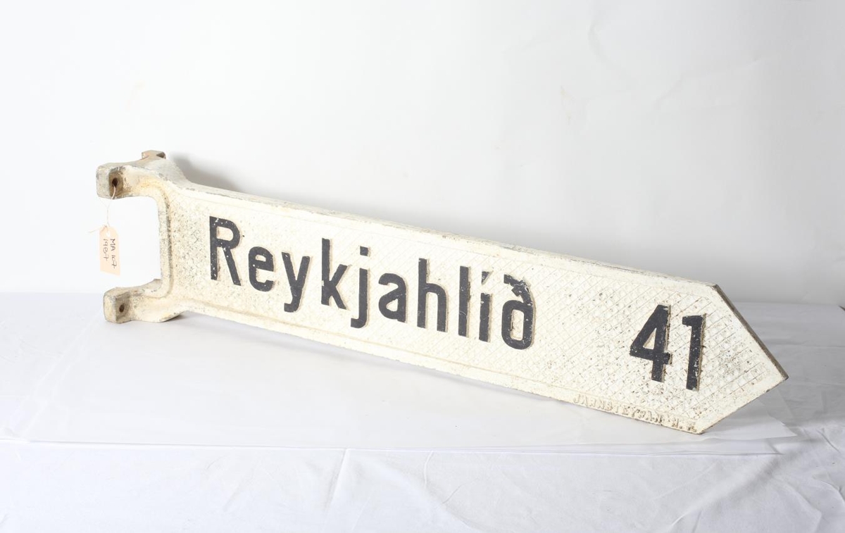 Vegprestur úr potti, hvítmálaður með svörtum stöfum á. Á stendur "Reykjahlíð 41", báðu megin. Á skiltinu stendur Járnsteypan h.f. (sem framleiðandi).