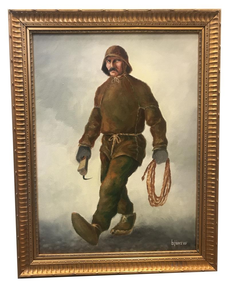 Málverk af sjómanni í skinnklðum með reipi og haka. Aftan á myndinni stendur: Laskaskinnstakkur.