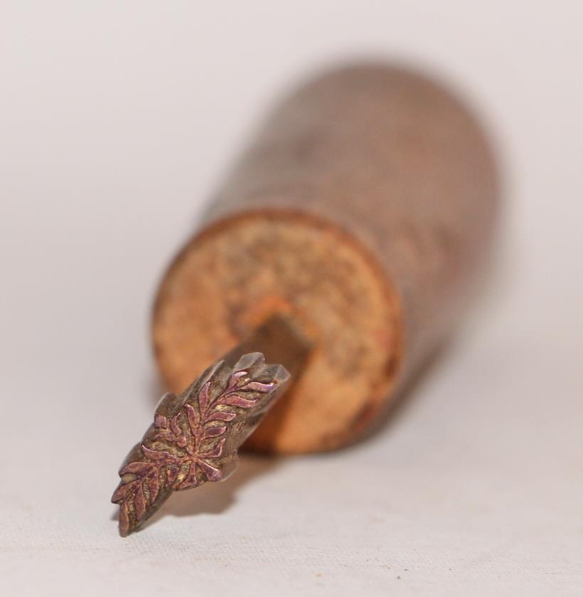 Stimpill, smíðaður úr koparteini, köntuðum. Er teinninn rekinn inn í sívalt tréhandfang. Lengd 14,3 cm. Breidd stimpilsins sjálfs er 2 cm. Stimpillinn er eins konar greinar með smáblómstri í miðjunni.