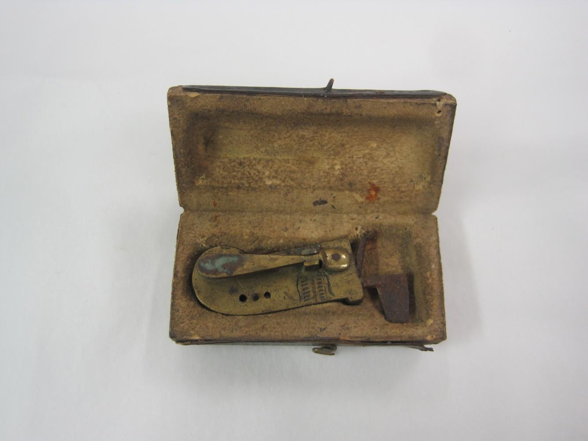 Bólusetningarverkfæri frá Brokey á Breiðafirði. Hnífur í kassa, æðaopnari til blóðtöku. Í upphafi hefur þetta verið vandaður hlutur, hnífurinn er í leðurklæddum kassa þar sem hann er grópaður niður.