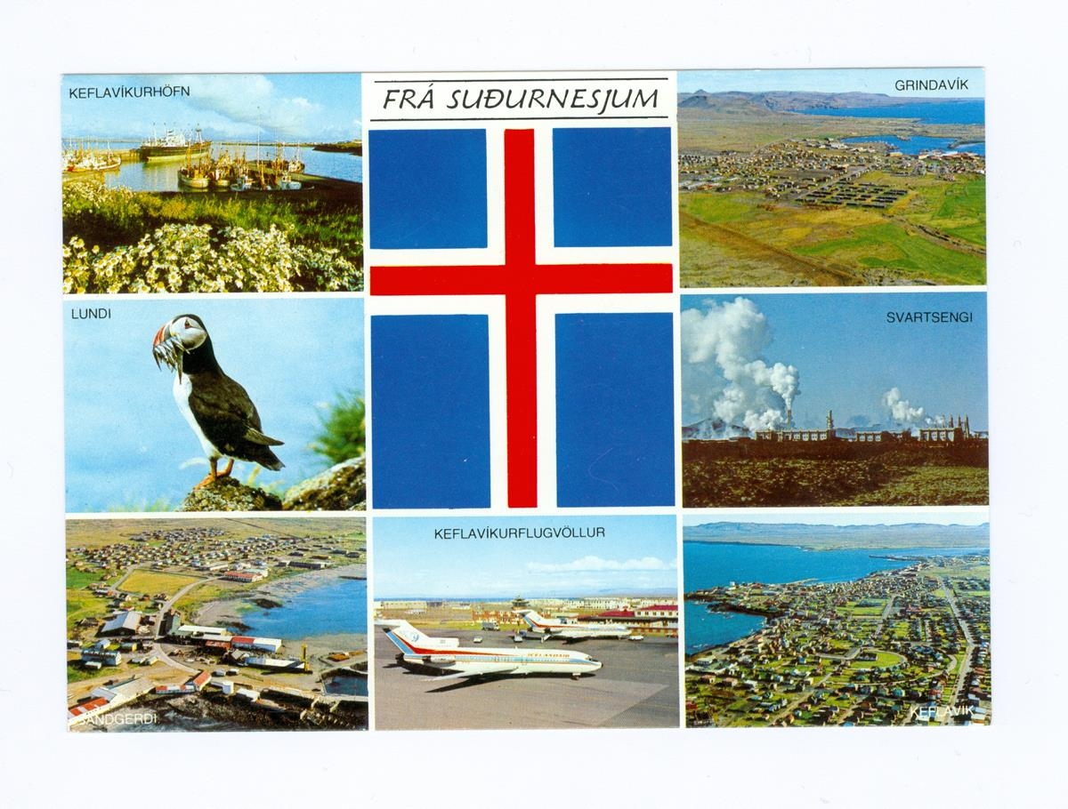 Póstkort frá Suðurnesjum með smámyndum af Keflavíkurhöfn, Grindavík, lunda, Svartsengi, Sandgerði, Keflavíkurflugvelli og Keflavík. Kortið er með íslenska fánann í miðju.