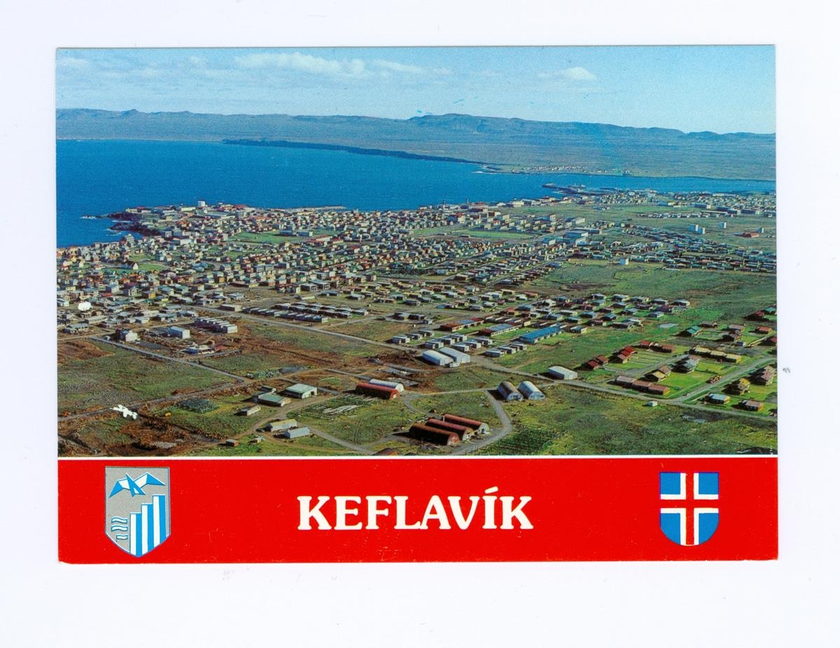 Póstkort af Keflavík frá því um 1978. Við botninn er borði sem er með skjaldarmerki Keflavíkur og íslenska fánann og ritað Keflavík á milli merkjanna.
