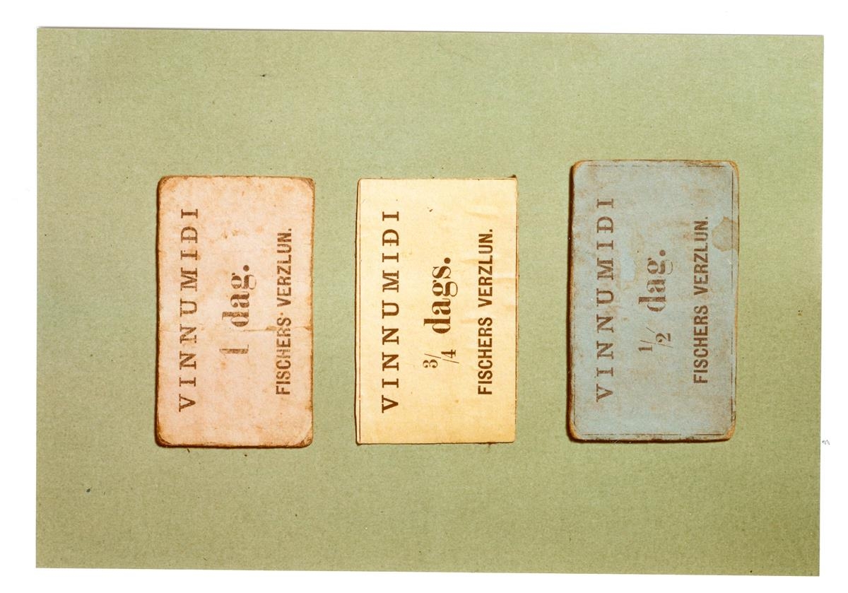 Ljósrit af þrem vinnumiðum frá Fischer's verzlun uppá vinnu í 1 dag, 3/4 dag og 1/2 dag.