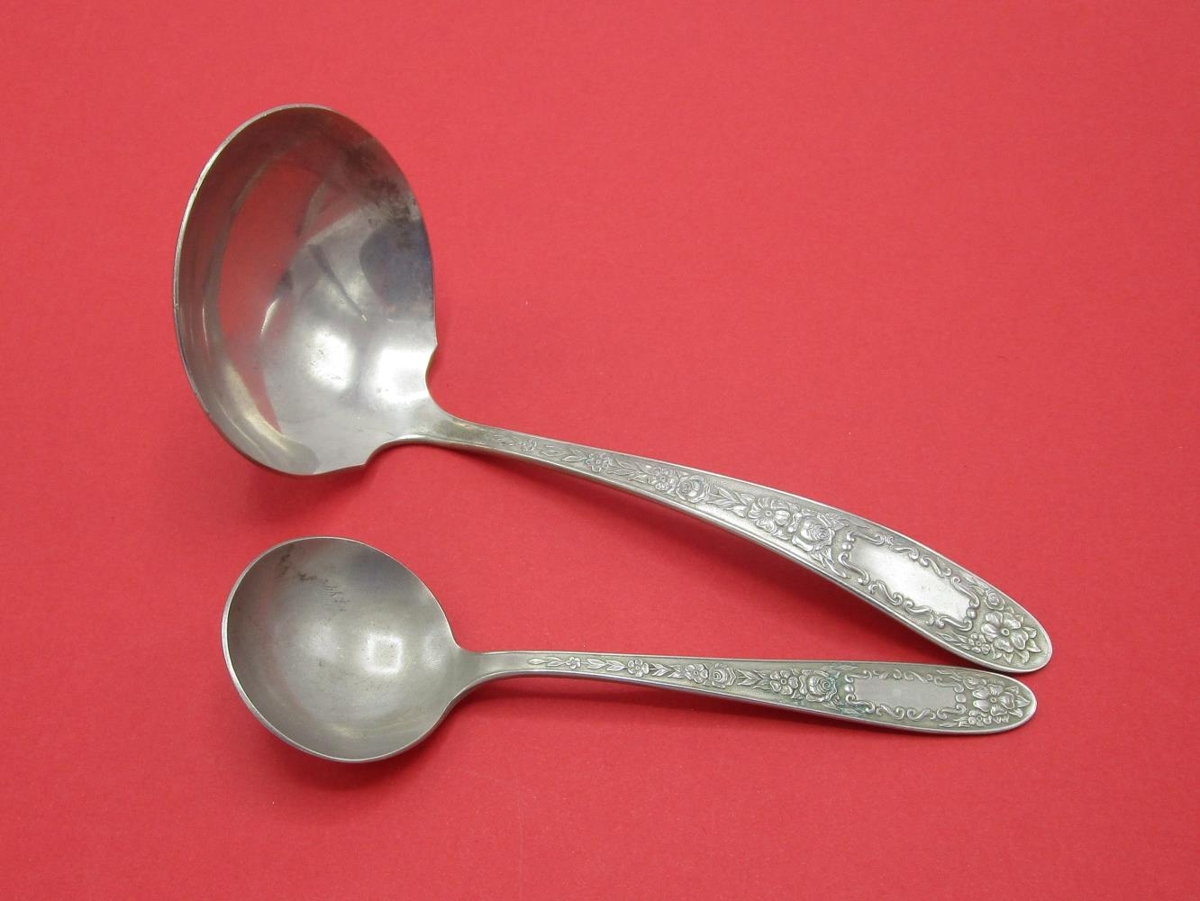 Tvær misstórar skeiðar. Rjómaskeið 16 cm og sykurskeið 13 cm. Samskonar fínlegt blómamunstur á báðum. Merktar: ALPACA Made in USA.