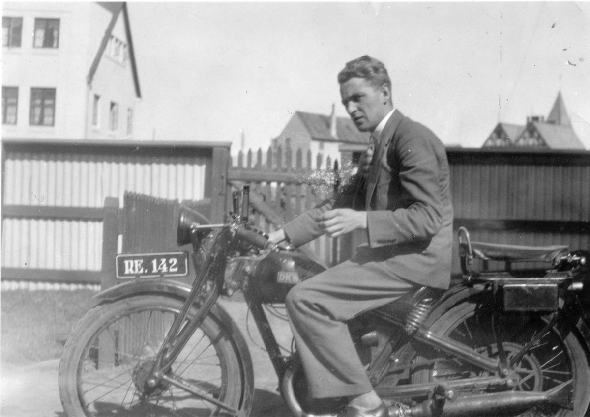 Jakkafataklæddur maður á mótorhjóli í vesturbæ Reykjavíkur.Girðing og hús í bakgrunni. Líklega sést í Landakotsskóla.