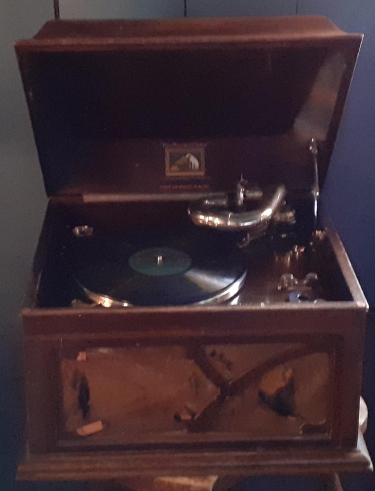 Plötuspilari sem Haukur Sveinbjörnsson á Snorrastöðum í Kolbeinsstaðahreppi gaf. Kassinn er 47x41x34 cm. Á honum stendur: His Master´'s Voice. The Gramophone Company Ltd. Hayes Middlesex.