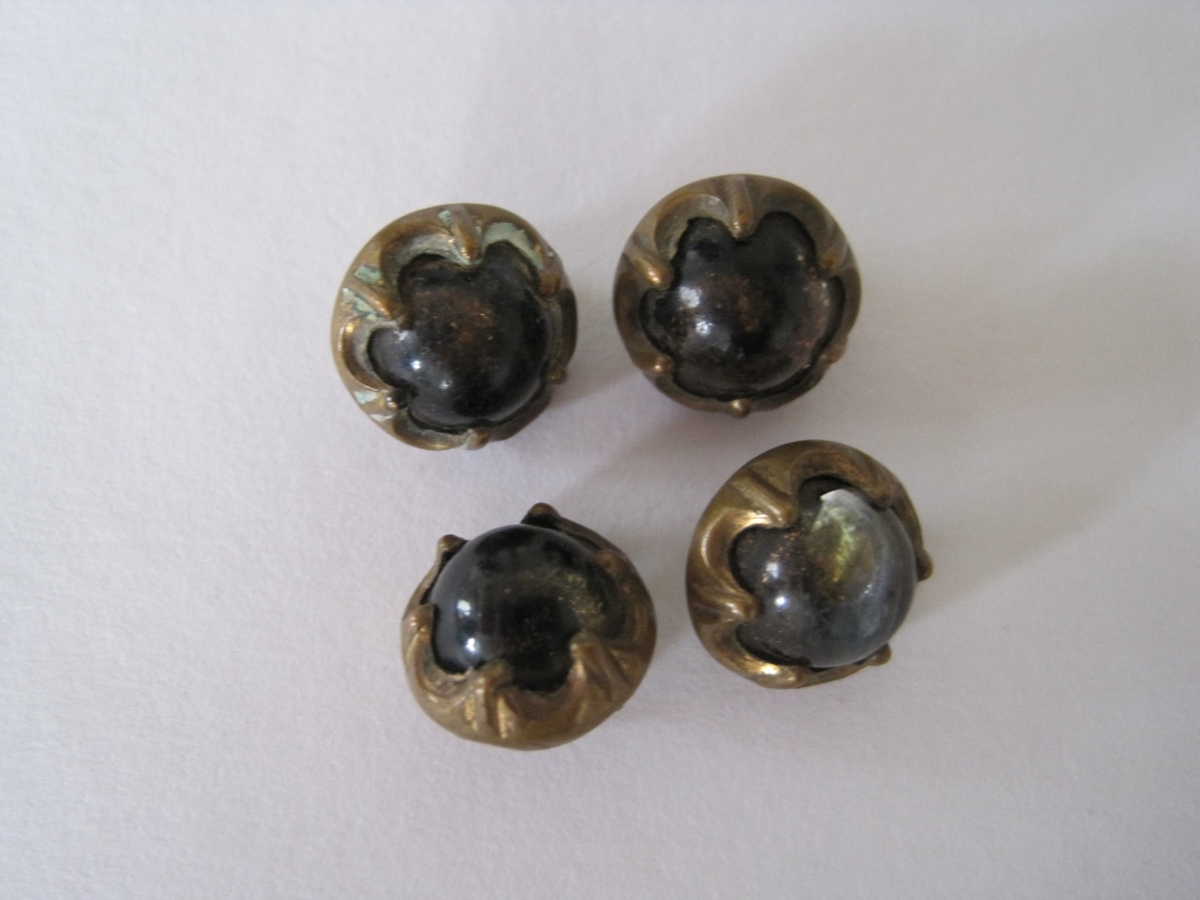 Hnappar af vesti, glerperlur greiptar í málm. Þessir hnappar eru fornir og voru í eigu Sveinbjörns Jónssonar á Snorrastöðum.