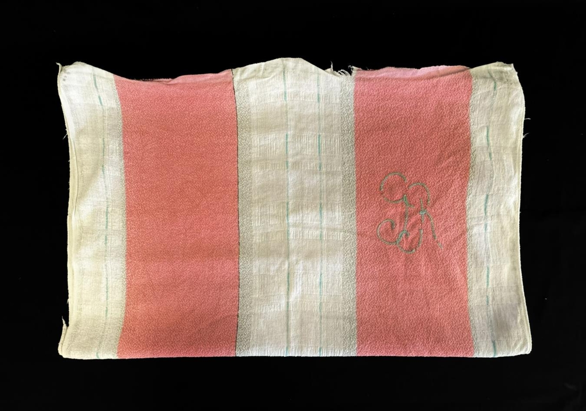 Hvítt og bleikt handklæði með 2 mjóum græn röndum langsum eftir handklæðinu. Bleiki hlutinn í miðjunni. Saumað út í það upphafsstafirnir GR - sem standa fyrir Guðbjörgu Ringsted sem átti handklæðið. Snjáð á köntum. Kom ásamt sund- og leikfimifötum GR.
