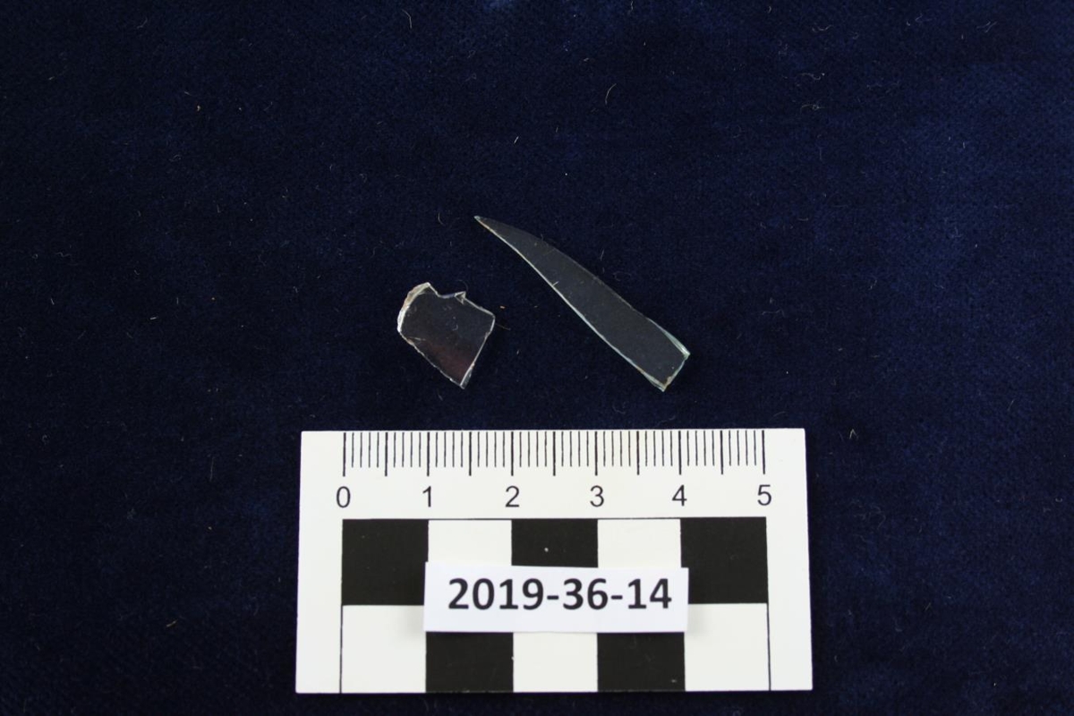 Glært, þunnt gler í tveimur brotum, annað er bláleitara.