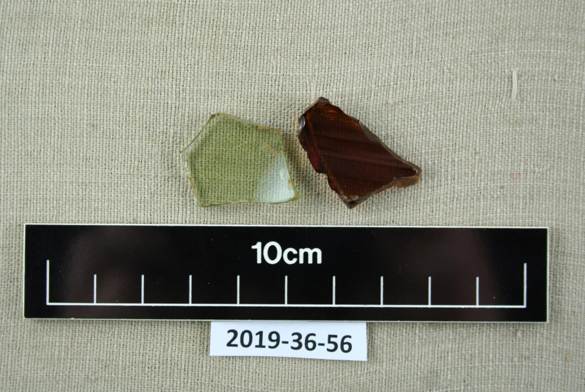 Tvö glerbrot af mismunandi litstærð en svipaðri stærð. Eitt brotanna er glært með grænum blæ og hitt er brúnt. Líklegast er þetta flöskugler.