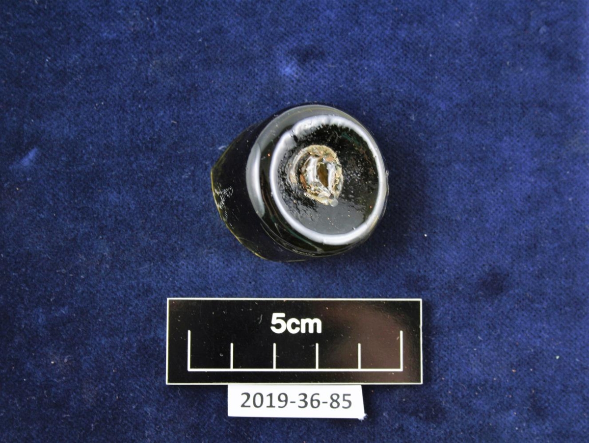 Hér er botn af dökkgrænni glerflösku. Glerflaskan er fremur mjó, hugsanlega hefur hún verið notuð fyrir meðal, en einnig gæti áfengi (eða hverskonar vökvi) hafa verið í henni. Botninn er kúptur, upphækkun í miðju flösku nær 0.8cm. Eitt brot er búið að myndast í síðu glersins.