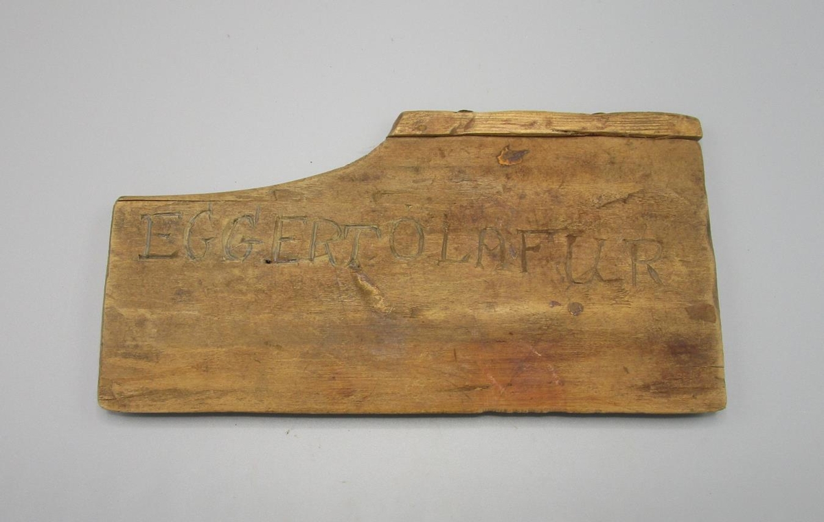 Sniðmát sem í er skorið: EGGERT ÓLAFUR. Eggert Ólafur var faðir Unnar Ólafsdóttur. Sniðmátið er í poka með seglasaumsáhöldum BSH 1869.