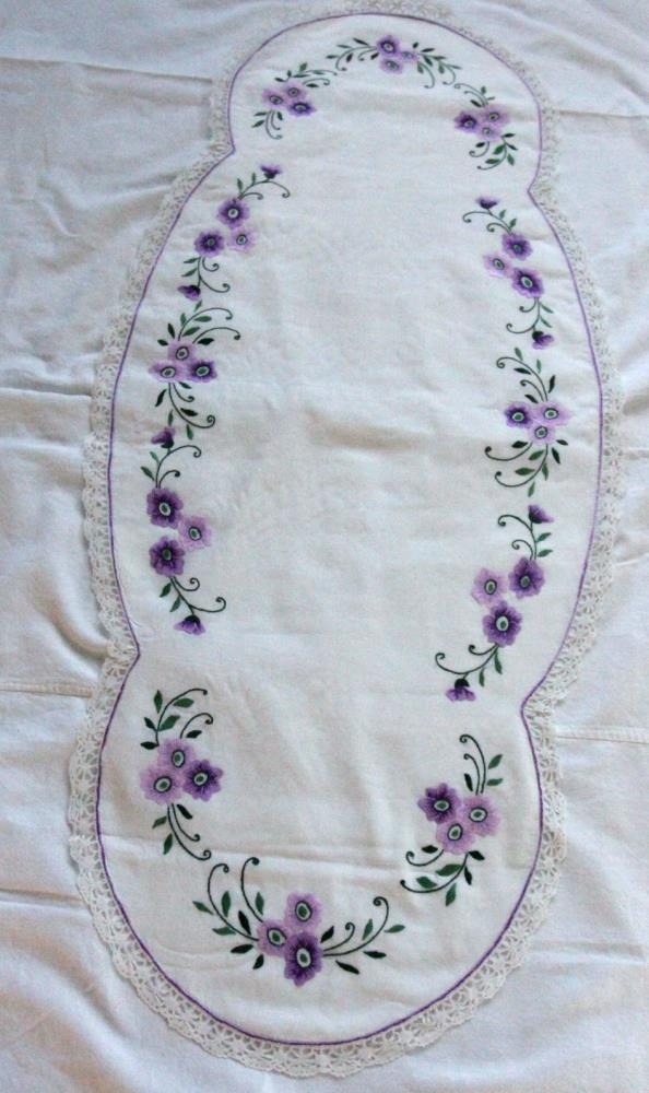 Borðdúkur úr hvítum fínum bómullarjafa, með hvítri blúndu, lengd 96 cm, breidd 32-41 cm. Með blúndunni er saumað með aftursting í fjólubláum lit, umhverfis eru saumuð blómamynstur í símunstri, fjólublá blóm með grænum blöðum. Mjög fínn saumur með mislöngum sporum.