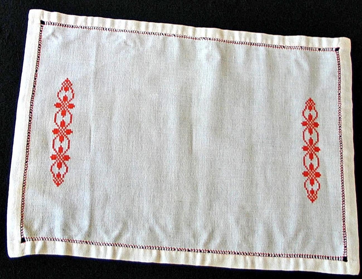 Lítill borðdúkur. Lengd 38,5 cm, breidd 27,3 cm. Hvítur bómullardúkur. Saumað í með krosssaumi með appelsínugulu mynstri á sitt hvorum skammenda. Með faldi er saumað með sama garni með svartsaumi. Snotur borðdúkur á fráleggsborð. Gefandi Ásta Hartmannsdóttir Safamýri 49 Reykjavík, sem saumaði dúkinn.