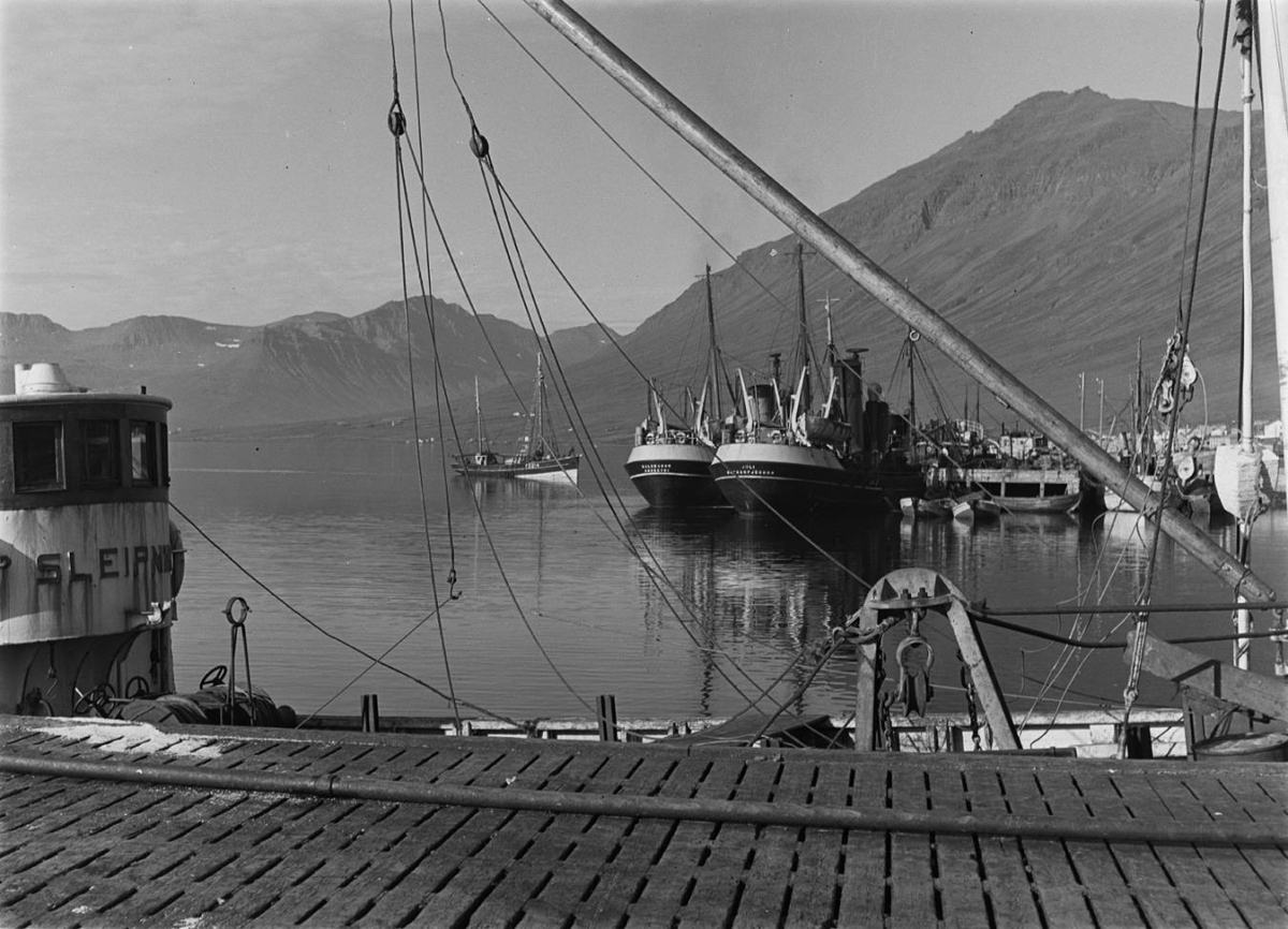 Frá Neskaupstað (ekki tímasett). Skipið í forgrunni heitir Sleipnir og á skut skipsins fjær t.h. stendur Júlí Hafnarfjörður og hinu Kaldbakur Akureyri. Á kinnung kútters t.v. eru stafirnir FD 814.