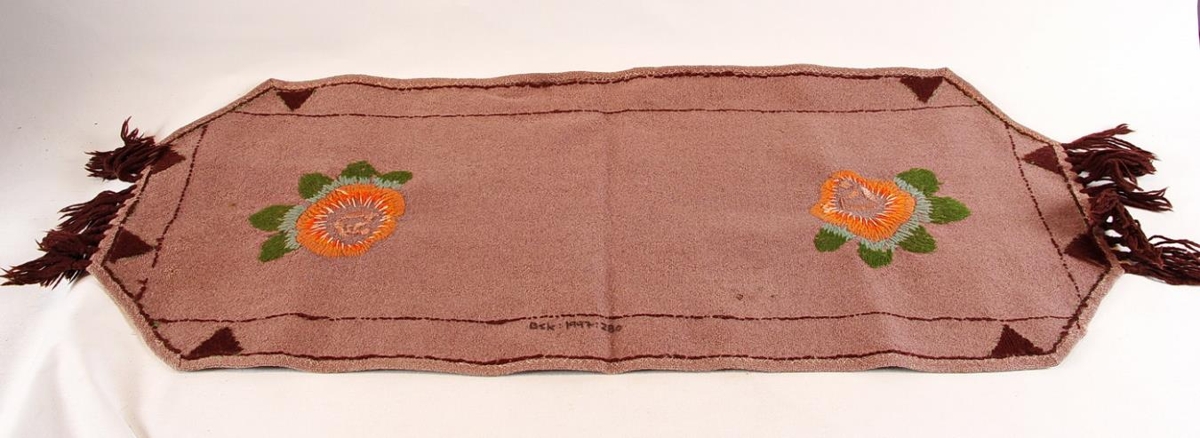 Borðdregill úr ullardúk, ljósbrúnn. Stærð 67,5 x 28,5 cm. Hornskorinn. Ísaumaður með dökkbrúnu ullarbandi sem myndar sauma utan um, með jöðrum og kögur á sitthvorum enda úr sama efni. Saumað með aftursting, kontorsaum og glitsaumi. Tvær rósir, ein sitthvoru megin, eru á dúknum. Rósirnar eru gular og ljósbrúnar, með grænum blöðum. Saumaðar með mislöngu spori sömuleiðis með ullarbandi nema innsti partur rósanna sem er úr ljósbrúnu bómullargarni.