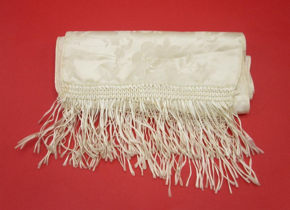 Slifsi, ljóst að lit með íofnu blómamynstri og samlitu kögri.
